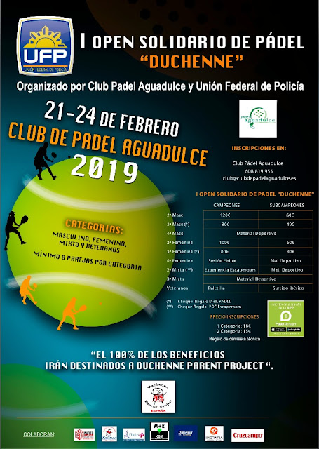 El pasado fin de semana se clausuró el I Open Duchenne de pádel, organizado por el sindicato de policía nacional UFP y el club de pádel de Aguadulce. El objetivo de dicho torneo ha sido el de recaudar fondos para la asociación Duchenne Parent Project en Almería. El torneo se inició el pasado jueves 21 y se ha desarrollado durante 4 jornadas hasta el domingo 25. La inscripción ha sido un éxito con un total de 106 jugadores, distribuidos en varias categorías, masculino, femenino, mixto y veteranos.
